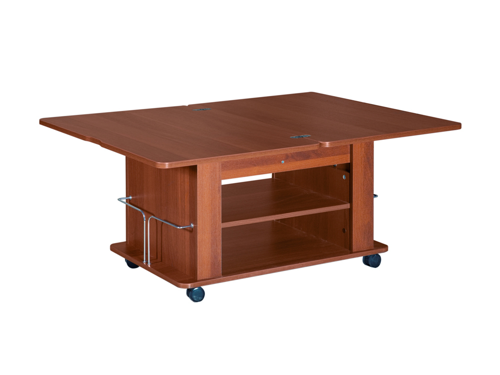 «Агат 19.1» – многофункциональный стол, который может использоваться в различных положениях, представленных на схемах. Это достигается за счет наличия подъемного и поворотного механизмов, которые превращают журнальный стол в обеденный. Данную модель дополняет металлическая газетница и ниша для хранения мелочей.