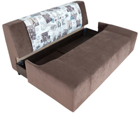 Современный стильный дизайн. Возможность использования как центральный обьект интерьера. При трансформации требуется небольшое расстояние между стеной и диваном. Наличие ящика для хранения постельных принадлежностей. В основании спинки и сиденья деревянные рамки с пружиной- змейкой, на которые кладется термовойлок, пружинный блок и эластичный пенополиуретан. Приспинные подушки не съемные, они вшиты в чехол и заполнены мягким ППУ. Механизм раскладки- пантограф (тик-так)