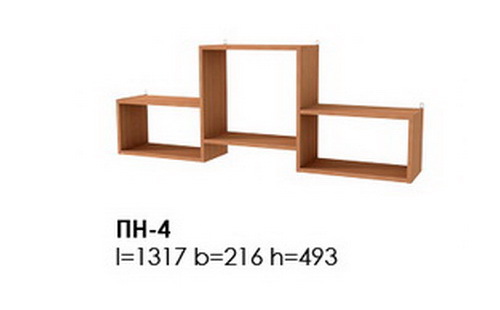 Полка ПН-4 имеет необычный дизайн. Вы можете повесить ее над компьютерным столом и размещать на ней различные подручные материалы. Полка имеет двухъярусную структуру.  Полка крепится на стенку, благодаря двум задним планкам.